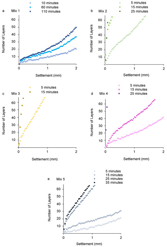 Deformation results illustrated in Figure 13 show how mixes 1–5, extruded into 8 mm diameter beads, settled when subjected to compressive loading representing subsequent layers deposited on top of the bead. The laboratory temperature was 22 °C during the tests, hence the swift hydration times, and tests were conducted for the duration of mix open times. Mix 1 is shown over a much longer time period, since its lack of CAC/CS means it has an open time of ≈2 h. It can be seen from Figure 13, particularly for mixes 2 and 3, that OPC/PFA/CAC/CS material, without retardation, hardens very quickly at 22 °C, which provides excellent buildability, but is challenging for deposition device extrusion.