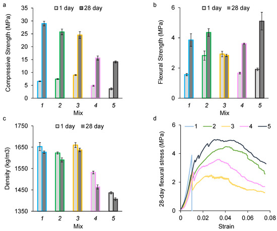 Figure 14 shows compressive and flexural strength test results at both one day and twenty-eight days following mixing, along with the density of the hydrated specimens and the flexural stress–strain profiles at twenty-eight days. Coefficients of variation range between: Compressive strength 1-day 2–11%, Compressive strength 28-day 2–5%, Flexural strength 1-day 3–11%, Flexural strength 28-day 1–11%, Density 1-day and 28-day ≈1%, with 28-day flexural strength of the high-foam content mix 5 exhibiting the highest variation at 11.5%.