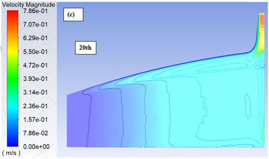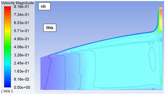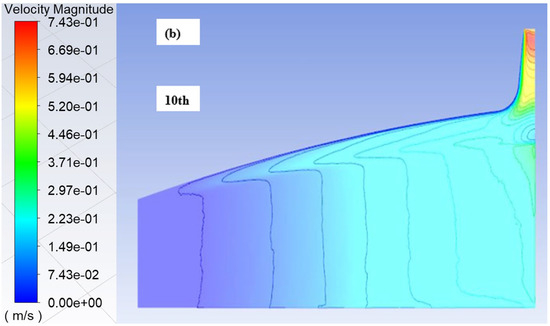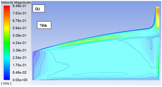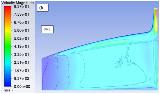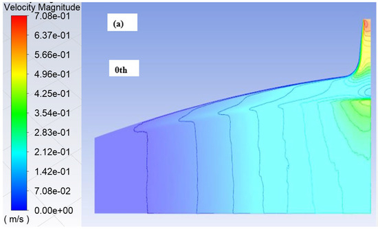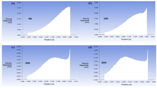 Figure 7 illustrates the improved velocity distribution across the die land after 80 iterations. Initially, during the 0th iteration (Figure 7a), the low-velocity region (ranging from 0 to 0.142 m/s) occupied one-third of the die from the edge. However, in the 80th iteration (Figure 7i), a uniform distribution was achieved across the land ranging from 0.172 m/s to 0.258 m/s. Nonetheless, there is a small region in the middle where the velocity ranges from 0.515 m/s to 0.061 m/s.