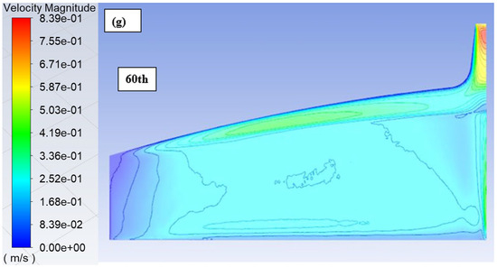 Velocity contour plots: (a) 0th iteration, (b) 10th iteration, (c) 20th iteration, (d) 30th iteration, (e) 40th iteration, (f) 50th iteration, (g) 60th iteration, (h) 70th iteration, and (i) 80th iteration.