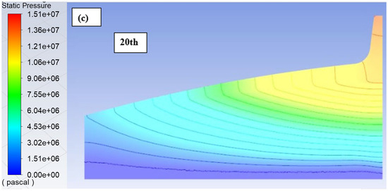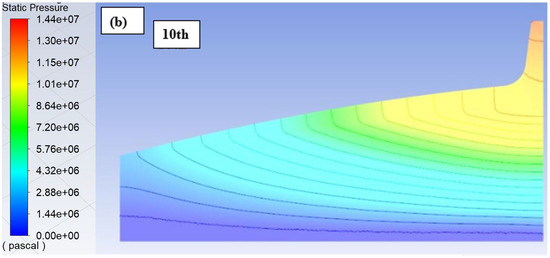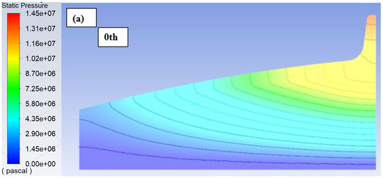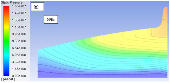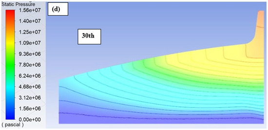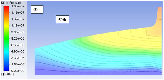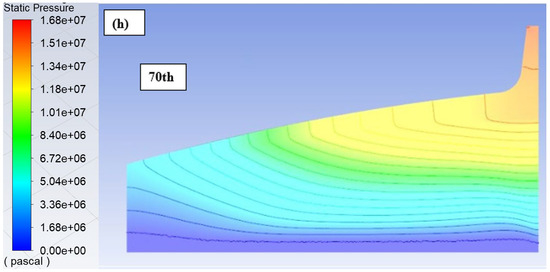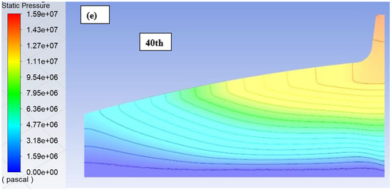 In addition, the pressure distribution recorded in Figure 8 reveals that the difference between the inlet and outlet pressures results in the pressure drop value. Given that the inlet pressure is considerably greater than the outlet pressure, the pressure drop value is equivalent to the inlet pressure in our case. However, after 80 iterations, the pressure drop value remained unchanged as our target observation was solely the reduction in mass flux variance. Figure 8 depicts that the pressure drop value increased from 14.5 MPa to 16.5 MPa from the 0th (Figure 8a) to the 80th (Figure 8i) iteration, indicating that the improvements made to the coat-hanger die’s flow uniformity did not yield favorable pressure results. This is because we only used mass flux variance as our observable during the simulation.