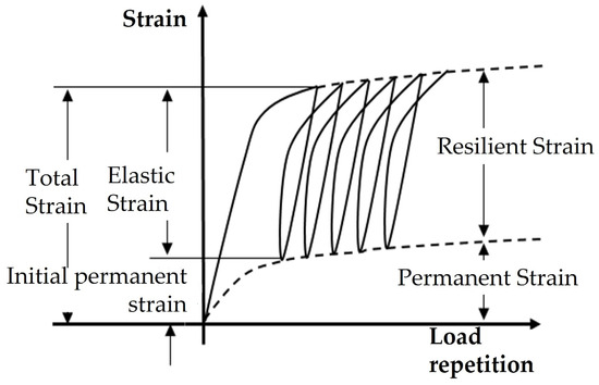 The unbound materials respond to axial wheel loading in a nonlinear elastic manner. During the early stages of loading, the unbound materials face some plastic deformation. As shown in Figure 1, the plastic deformation rises slowly during the first load repetitions and remains nearly constant, irrespective of further load repetitions. Araya et al. [34] showed that after the first few load applications, the increment of non-recoverable deformation is much smaller compared to the increment of resilient/recoverable deformation. As such, plastic deformation can be considered negligible under normal conditions in the case of transient traffic loads.