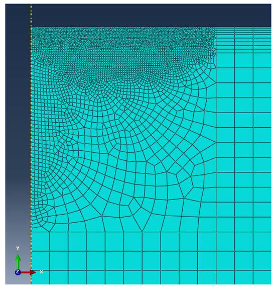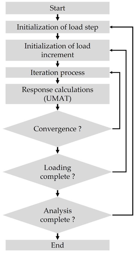 The model shown in Equation (2) was coded in a subroutine and incorporated into a FEM model in ABAQUS. The flowchart of the FEM analysis with the UMAT subroutine is shown in Figure 3. The considered load was assumed to be static (uniform pressure of 0.8 MPa) from a single circular wheel, but it was imposed incrementally. The nonlinear analysis was based on the modified Newton’s method with secant stiffness. The meshing of the model structure was carried out with quadratic elements of 8 nodes (CAX8R). Denser elements were considered near the area of loading, whereas a coarser meshing was applied for the rest of the structure (Figure 4). Finally, all of the layer interfaces were assumed to be fully bonded.