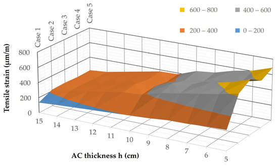 In phase B, a sensitivity analysis of the predicted pavement responses depending mainly on the AC modulus and thickness is presented (recall Table 1). Layer thicknesses and material properties for both phases of analysis were considered as per Figure 2 and Table 1, too. In phase B, only results from cases 1 and 5 were evaluated based on the justification provided in the following subsections.