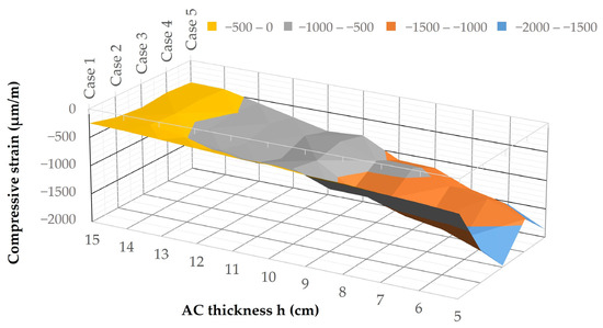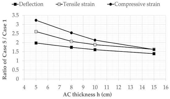 Figure 5, Figure 6 and Figure 7 present predicted deflections and strains for the whole range of AC layer thicknesses from 5 to 15 cm. In particular, maximum deflections are predicted to be 1.39–1.98 times greater in case 5 than in the corresponding linear analysis. The ranges of ratios for tensile and compressive strain prediction are 1.63–2.61 and 1.62–3.23, respectively.