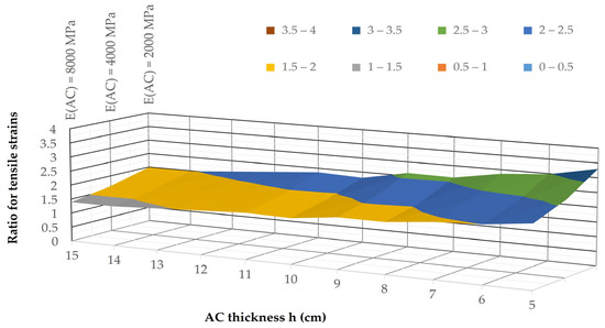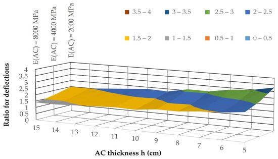 Nevertheless, even for the largest AC thickness under investigation (15 cm), the differences in all predicted responses are still considerable. Thus, there is a margin for necessary improvements and optimization in the way pavement design takes place, which is further supported by the findings presented in Section 4.2.