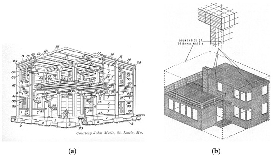 Early modular open systems in theory and practice of construction: (a) the Conzelmann’s patented “Unit Structural Concrete Method”, 1912 [21]; (b) the Bemis cubical 4-inch module, 1936 [28].