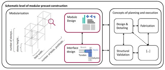 The basic concepts defined and explained in the previous section are embedded in a process-related view in the following. For this purpose, the construction kit for skeleton structures documented in [57] is used exemplarily. The technical process map is divided into a schematic level and a project-oriented level, represented in Figure 3 and Figure 4. The process map is explained and discussed in the following, indicating methodological guidelines and challenges to be considered, in particular, for modular precast construction. They mainly consist of methods for modularisation, which include the design of both the modules and the interfaces and concepts of planning and execution, which go beyond the approaches of unique, in situ construction (Figure 3).