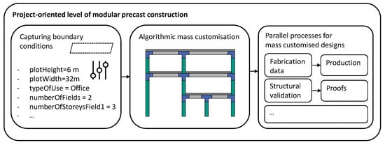 Modularisation allows many individualised construction projects to be executed with the same modules, arrangement logic, and downstream processes while maintaining scale effects. Thereby, the individualised modular project starts by capturing project boundary conditions and channeling them into the mass customisation process, as shown in Figure 4. The following subsections explain the details on this specific level of abstraction.