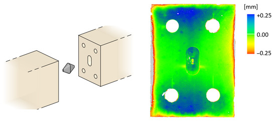 For the integration of recesses into the concrete components, 3D-printed molds made of plastic were identified as a suitable formwork inlays. Figure 7 shows this recess in the surface of a concrete component as conceptual design (left) and a heat map of the joint surface (right). Four tubes are provided for post-tensioning. At the overall surface of the joint, maximum shape deviations of approx. ±0.25 mm result. For the area of the recesses, the deviations correspond to only approx. ±0.1 mm. These small deviations in shape ensure that the load-bearing elements can be assembled quickly and precisely without great technical effort. The centring of the connector element and therefore modules could be proven during the assembly for experimental tests of the shear load capacity.