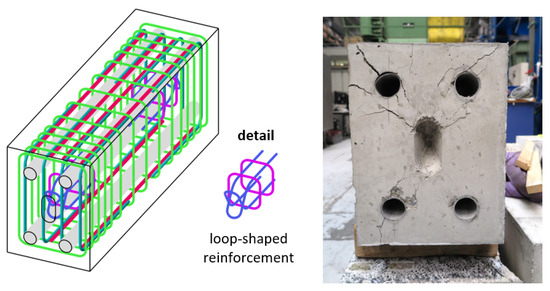 Figure 8 shows the reinforcement layout of the load-bearing elements with the detail of the area surrounding the recess of the concrete component. A loop-shaped reinforcement pattern was derived to withstand splitting tensile forces in the area of the recess and to ensure the ductile behaviour of the concrete component under shear loading.