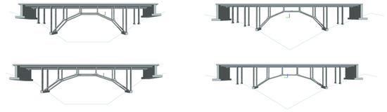 A modularisation method for an arch bridge was developed as a necessary preparatory work, considering the architectural requirements of variable topography. In detail, the modularisation treats the bridge substructure and foundations. The system utilises simple, panel-like modules with side lengths ranging from 2.0 to 3.5 m. In parallel, additive manufacturing using ultra-high-performance concrete (UHPC) is being investigated [63]. To cover the various interfaces, such as support and joining situations, seven module variants of this panel module were derived, mainly varying due to different interface specifications, for example, the varying placement of prestressing, plug connections, and inlay parts. The design of the system is discussed more in detail in [64]. All module variants, foundations, and superstructure elements were modelled as parametrised, schematic parts in a product modelling software to be used as building blocks of an algorithmic mass customisation process. The researchers developed a model-based, two-step design process. In the first step, alignment and topography are imported, and a steering sketch is fitted between those elements within certain architectural constraints. In the second step, the algorithm processes the steering sketch to generate and place all project-specific components, including inlay components such as plugs and tendons. Figure 9 shows the variability of the modular bridge system for different topographies and parameters. Based on the predefined modules, algorithmic mass customisation allows for an efficient and high-quality model generation in a few seconds [58].