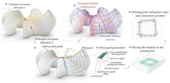 The semi-automatic mass customisation process builds on the pq-mesh algorithm [66] that considers maximal geometric uniformity. An optimisation of the joint orientation parallel to the principal stresses in the shells is added as a second optimisation criterion. The necessary parameters to instantiate and orient all modules for the detailing of modules are computationally derived from the pq-mesh. For the given design model, the generation of fabrication information is also the subject of the research project, currently via the machine data-oriented programming language g-code [65]. The data exchange involves all data required for the developed additive manufacturing process, such as the description of the printing path of the thickened edges, the infill and textile reinforcement, the drilling position, the diameter, and the depth.