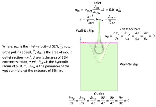 Using a first upwind strategy, the implicit segregated-iterative method yields the governing discretized equations as a first approach. Next, the SIMPLEC algorithm was considered for pressure–velocity coupling, and the body force weight was employed for pressure interpolation. Eventually, the convergence criterion was established when the total of the residuals was equal to or less than 10−4. The mold thickness and width were constant for all studied cases; two simulated SEN immersions were used for five different casting speeds. After this, a modified SEN was created using the same simulated points and this newly proposed geometry. The physical properties of the fluid are illustrated in Table 1.