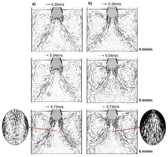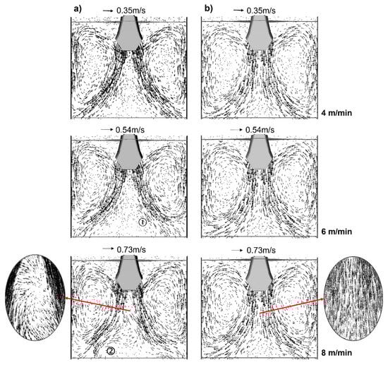 The nozzle is placed in 34 cm immersion (see Figure 5), which presents the typical pattern of thin-slab flows. However, as the casting speed increases, the jets begin to oscillate. Figure 5a shows the most significant deviation on the left jet (speed 6 m/min, point 1), and on some occasions, the jet on the right side, as shown in Figure 5a, at a speed of 8 m/min. The proposed study was deeper, considering the immersion depths of the nozzles, the different casting speeds, and the space between the jets. Thus, it can be seen that the space between the two jets at both nozzle immersion depths and the different casting speeds is used so that there is an exchange of energy between the vorticity generated due to the separation of the boundary layer in the divider of the ports and the vorticity coming from the recirculation from the bottom of the mold. Hence, the vorticity is due to the separation of the boundary layer in the port divider. In the case of the optimized nozzle in Figure 5b, the jets maintain good symmetry in the three speeds analyzed because of the flow direction caused by the optimization of the division of the ports of this nozzle. This avoids the formation of vorticity caused by the detachment of the boundary layer of the port divider towards the mold, and the effects of vorticity coming from the bottom of the mold will hardly affect the stability of the jets from the nozzle ports.
