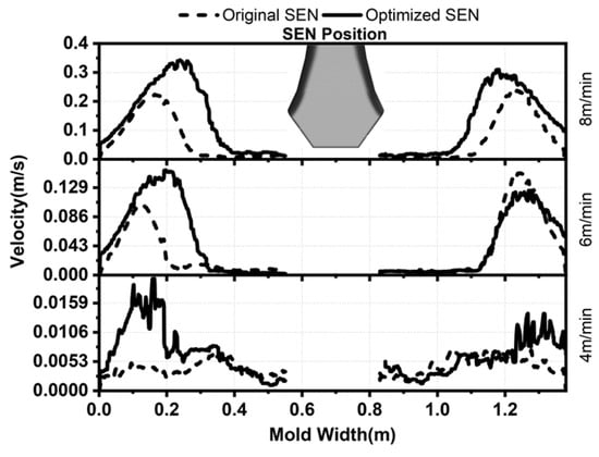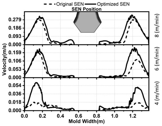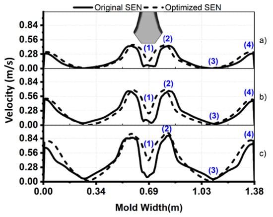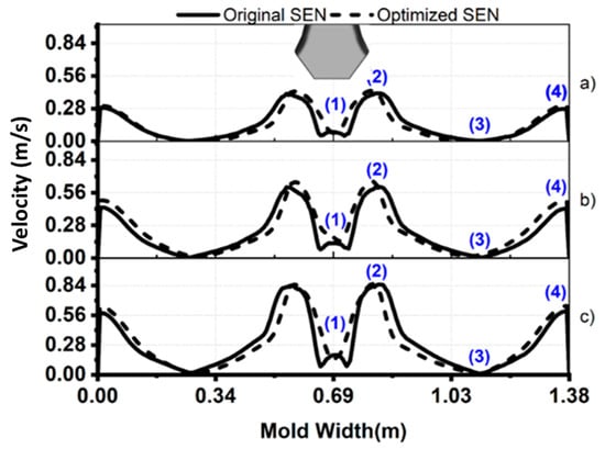 Velocity vs. mold width for 22 cm immersion contrasted for original SEN and optimized SEN. (a) Casting speed 4 m/min, (b) Casting speed 6 m/min, (c) Casting speed 8 m/min.