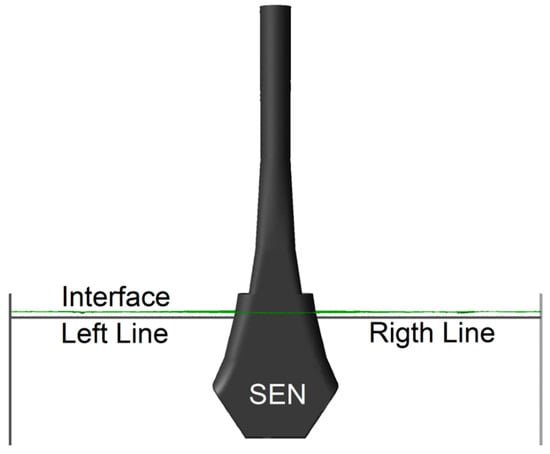The proposed methodology considers drawing two lines at 7 mm height from the left side of the nozzle to the right side of the mold below the interface to check the stability of the interface (air–steel). Both nozzles and immersions used the methodology to measure the current velocities in that area (see Figure 8).