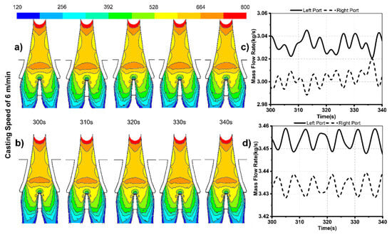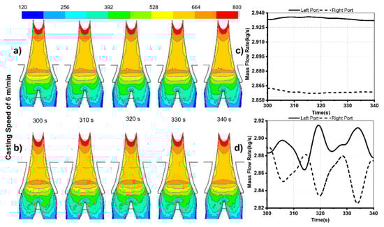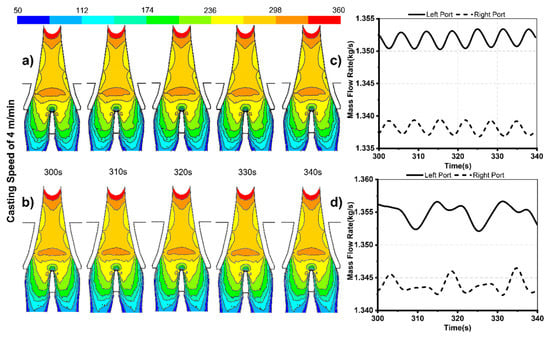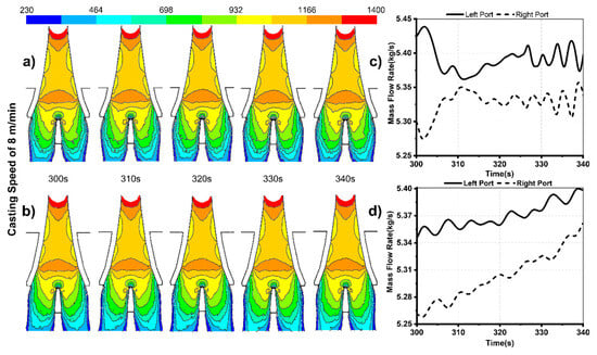 Dynamic pressure contour (Pa) in a central symmetrical original nozzle at an 8 m/min casting speed and mass flow monitoring for each port. (a,c) 22 cm immersion; (b,d) 34 cm immersion.