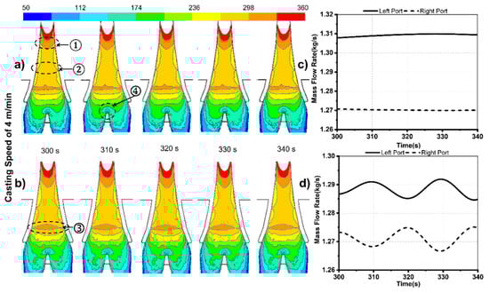 Dynamic pressure contour (Pa) in a central symmetrical original nozzle at a 4 m/min casting speed and mass flow monitoring for each port. (a,c) 22 cm immersion; (b,d) 34 cm immersion.