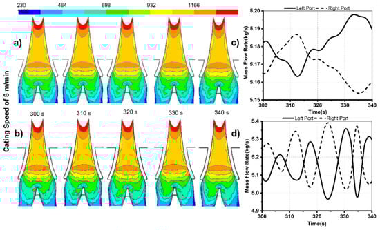 The elements discussed above are confirmed at a 22 cm immersion position, since observations showed that the fluid has a clear and constant tendency to exit through the left port. However, at 34 cm immersion, the variations observed at the tip of the mentioned triangle generate that the mass flow in each jet to oscillate, showing that the flow through the left side port periodically decreases and increases by the same magnitude as the right side port. When increasing the casting speed to 6 m/min, Figure 12 shows that at 22 cm of nozzle immersion, the zone of dynamic pressure variation on the tip of the triangle remains constant and that the fluid has the same tendency to exit more through the left port; see Figure 12a,c. At this same speed, at 34 cm immersion of the nozzle, the variations in dynamic pressure at the triangle tip become more evident. Figure 12b,d shows the jets’ effects on the oscillations. In the case of a casting speed of 8 m/min, variations on the triangle tip appear even from at 22 cm immersion, as seen in Figure 13a,c, and 34 cm immersion of the nozzle results in a higher oscillation frequency.