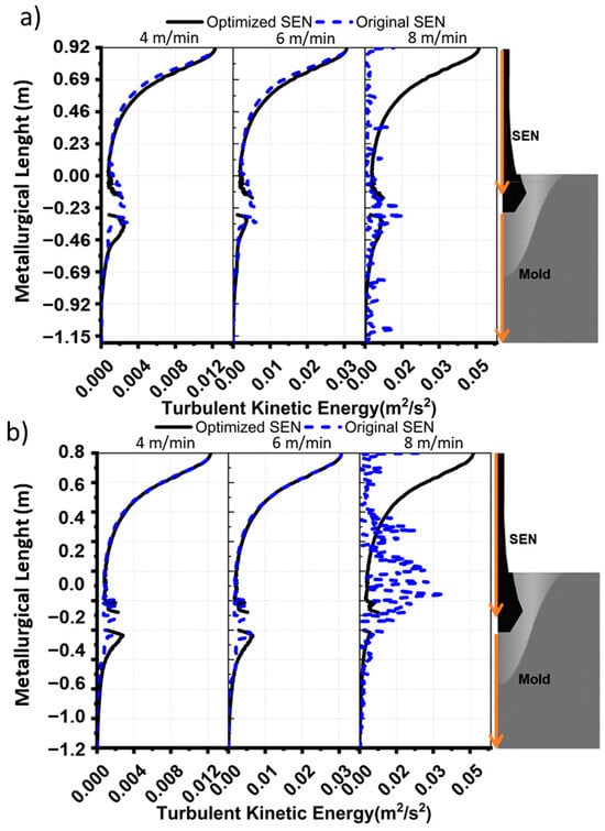 Part b of Figure 17 for a 34 cm nozzle immersion depicts the turbulent kinetic energy of the fluid inside the nozzle for a casting speed that comes from a maximum of kinetic energy production. The speed decreases as it moves deeper into the nozzle, until it reaches the division of the ports, managing to increase when colliding with it and reaching very similar values for both nozzles. Let us now analyze the nozzle for a 6 m/min casting speed. It can be seen how the original nozzle has a minimal production of turbulent kinetic energy both inside the nozzle and in the mold, while the optimized nozzle comes from a production of null kinetic energy at the entrance of the nozzle, increasing until it reaches a maximum of 20 cm inside the nozzle and gradually decreasing until it reaches the tip of the division of the ports, where it reaches a maximum value in the production of turbulent kinetic energy.