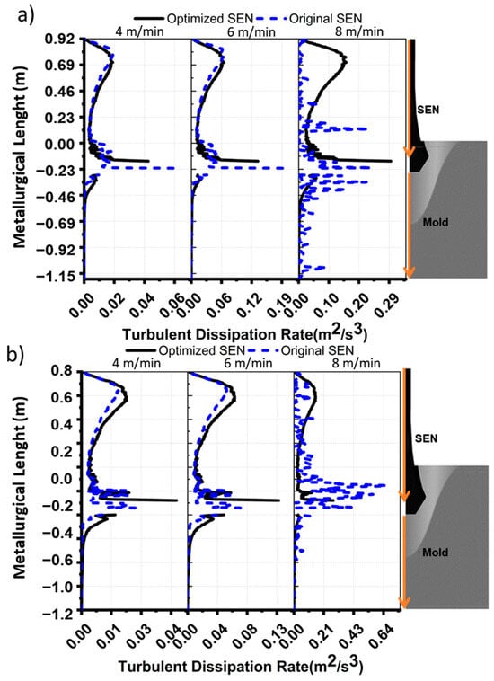 Effect of the internal geometry of the nozzle and the metallurgical height on the turbulent dissipation rate, measured in a vertical line drawn inside the nozzle and the mold for (a) 22 cm nozzle immersion and (b) 34 cm nozzle immersion.