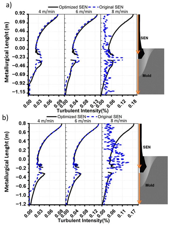 Effect of the internal geometry of the nozzle and the metallurgical height on the turbulent intensity, measured in a vertical line drawn inside the nozzle and the mold for (a) 22 cm nozzle immersion and (b) 34 cm nozzle immersion.