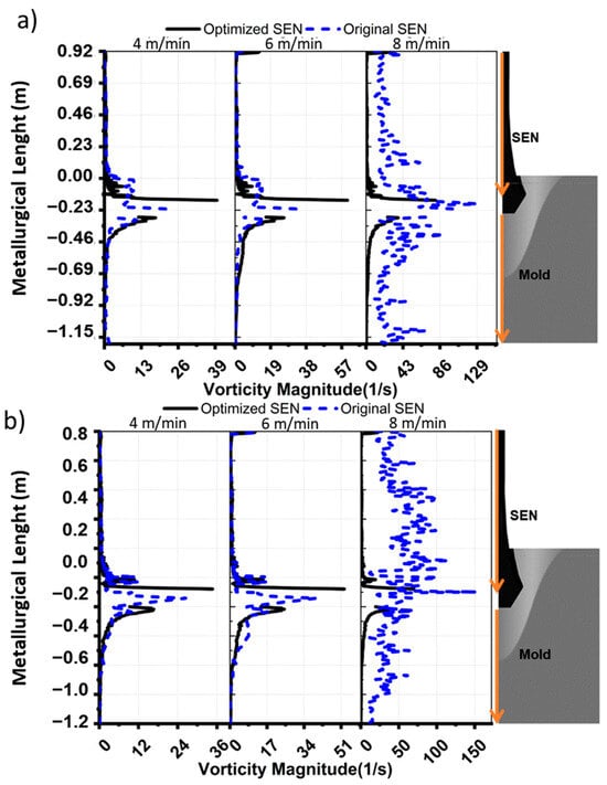 Finally, Figure 20 corresponds to 22 cm nozzle immersion (part (a)) and 34 cm of nozzle immersion (part (b)) for casting speeds of 4, 6, and 8 m/min. Here, casting speeds of 4 and 6 m/min, and 8 m/min, present the most noticeable vorticity changes, primarily due to the impact of the flow involving the division of the ports in the zone of the mold. In this consideration, the vortices fade due to the jets’ energy from the original nozzle. In contrast, the immediate vorticity suppression in the modified nozzle is due to the jets’ collision and the lack of space to develop the perturbation. At a speed of 8 m/min, entanglement occurs at the flow outlet of the original nozzle, caused by instability within the nozzle and resulting in vorticity formation inside the mold. The leading cause is the continuous oscillation of the nozzle jets inside the mold, putting the cleanliness of the cast steel at risk. As a result, the interface fluctuates, and the newly solidified steel crust experiences resistance due to continuous washing, provoking yarn break and a complete cessation of the process.