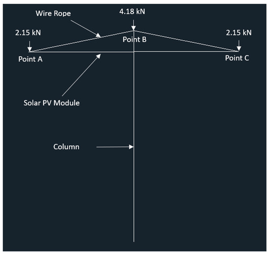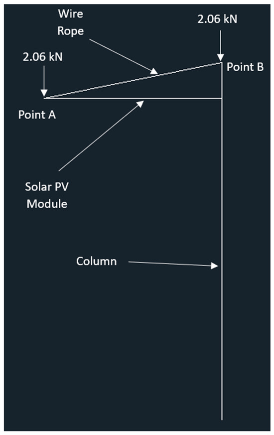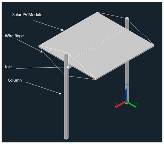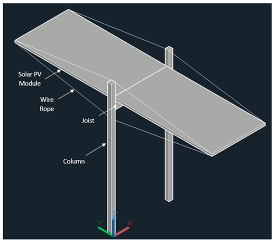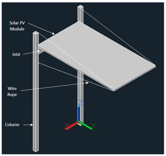 The structure consists of two posts, 184 mm × 184 mm in cross section. As for the T-shaped design, the height of the posts is 1848 mm above the ground wit. One beam, 38 mm × 140 mm in cross section, is attached to the posts to hold one end of the PV module. The other end of the module is held via 3/8” galvanized aircraft cable from the two sides [63]. Changing the length of the wire enables the change in the tilt angle of the modules. The analysis is performed with cables assumed to be making a 15° angle with the horizontal. A single module is cantilevered between two posts. Figure 2 shows the assembly of the structure with labelling.