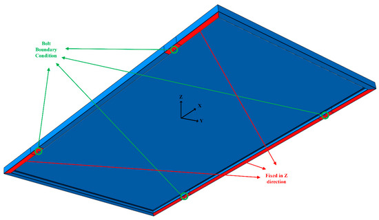 FEA is performed to ascertain if the racking design will result in stress that exceeds the yield/design stress of the aluminum frame used to hold the PV modules on the mounting structure. FEA was performed utilizing Abaqus/CAE 2022 on a computer equipped with an eighth generation Core i7 CPU and 16 GB of RAM. The PV module FEA model similar to [64] is considered, as it simulates a standard configuration, and encompasses a PV aluminum frame, PV laminate (consisting of glass, solar cells, ethylene-vinyl acetate (EVA), and back sheet), and rubber components. The simulation conducted in Abaqus resembles the boundary conditions of three designs discussed in Section 2.4. The FEA analysis took into account the behavior of the rubber within the PV module, incorporating material behaviors consistent with established research [65,66]. In the simulation, it was assumed that the rubber was bonded to the aluminum frame through tie constraints in Abaqus and, similarly, the laminate was attached to the rubber using tie constraints. Addressing the fasteners, one side of the PV module’s length had the frame’s bottom constrained in the Z direction to represent placement on a wooden rack, while a portion of the frame’s bottom on the other side was fixed in the Z direction to simulate the fixture used for the PV module as demonstrated in Figure 5. In another model, the boundary conditions for fixtures on the PV module are removed to see how this affects the final results. In the main FEA model, the bolts under the bottom of PV aluminum frame were simulated following a methodology presented by [64] to model their boundary conditions. Also, in another simulation, in order to analyze an alternative configuration for mounting PV modules with no fixtures, the bolts were drilled from the sides of the PV frame as shown in Figure 6. The material properties for all components used in the FEA are outlined in Table 6. The simulations considered the weight of all components, acknowledging its significance in real-world applications.