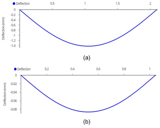 Finally, the maximum deflection using Equation (A18) is ascertained as 1.42 mm and 0.086 mm for the two designs (Figure 9).