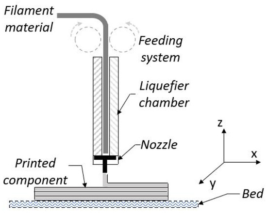 Although the printing process has similarities to injection processes, one of the biggest differences between the two is that in the printing process, material is deposited directly from the nozzle onto the component. Such deposition affects the temperature gradient. This effect can be evaluated by a shift function () using the polymer parameters and the reference temperature (), expressed by the Williams–Landel–Ferry relation [16] as follows: