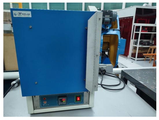 Printing was performed at a temperature of 205 °C and 50 °C on the printing side and build platform, respectively. Important parameters for components under cyclic loads are the raster angle, set at 45°, and the infill percentage, set to a 100%, as reported in [20]. The specimens were printed at room temperature. Ultimaker Cura was used for slicing the 3D printing model (in STL format). Then, the same software was used to control the settings of the 3D printing process and finally export the G code compatible with the manufacturing machine. Heat treatments were conducted using a precision furnace, preheated for 2 h to stabilize the treatment temperature (Figure 2). The component side that had contact with the printing bed was oriented toward the furnace chamber. An annealing treatment was applied to achieve uniform hardness, improve ductility, and alleviate residual forces generated during printing.