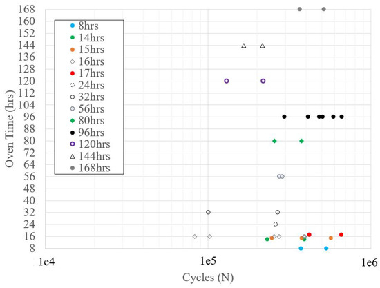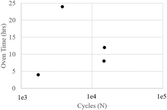 In the 60–120 °C range, the best approach of using 60 °C was evaluated for different oven times. The hardness at this temperature was 20 HV for oven times of 4, 8, 12, and 24 h. Note that there may be possible biases in these responses. Although the hardness was improved at temperatures above 60 °C, this resulted in a brittle component, as seen from the fatigue life evaluation shown in Figure 5.