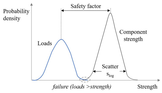 Heat treatment enhances the fatigue strength not only in terms of durability but also in terms of scatter reduction. In cases where the results exhibit a positive trend in durability, a minimum of three components with identical characteristics undergo testing. Conversely, two components were tested when the trend indicated a decline in durability, leading to failure. By its inherent nature, the process of accumulated mechanical fatigue damage is a statistical phenomenon dependent on factors such as the design, the load, the material, and the manufacturing process. Design variations can originate from tolerances that allow for a deviation from the nominal value. Loads were then determined by a load spectrum involving all load cases and variables such as the frequency, load sequence, and environmental conditions. Materials can also exhibit variations in mechanical properties, even from the same supplier or within the same production batch. Moreover, manufacturing processes can improve components’ resistance dispersion for subtractive and additive methods. These parameters collectively contribute to an increased strength variation, leading to failure when the most critical load is applied to the component with the lowest strength, as shown in Figure 6.