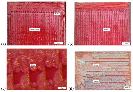 Optical microscopy of components (a) without treatment, (b) with ductile behavior, and (c) with brittle behavior and (d) a comparison between ductile and brittle failure.