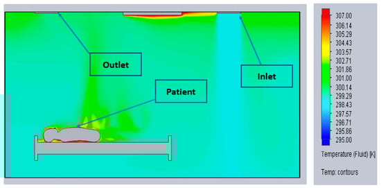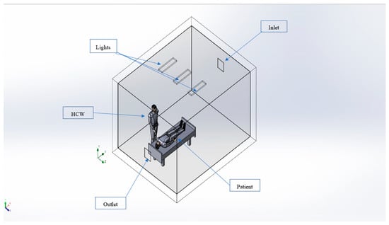 - Alkhalaf, M.; Ilinca, A.; Hayyani, M.Y. CFD Investigation of Ventilation Strategies to Remove Contaminants from a Hospital Room. Designs 2023, 7, 5. [Google Scholar] [CrossRef]