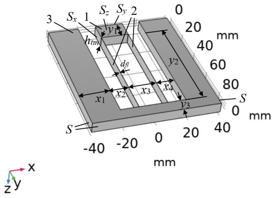 The same OMAS design was used in the case of bigger frequencies of measured acceleration, for which a bigger first eigenfrequency is required. Let us call such an OMAS “MEF” (medium eigenfrequency). Such OMASs are investigated elsewhere [9,15]. The geometry parameters of the considered OMAS made of fused silica were assigned as follows: x1 = 2 mm, x2 = 2 mm, x3 = 5.5 mm, x4 = 2 mm, y1 = 4 mm, y2 = 8.2 mm, y3 = 2 mm, the test mass square Stm = 22 mm2, its thickness htm = 1.7 mm, its mass mtmMEF = ρfs·y1·x3·htm = 0.0824 mg, two flexures supporting the test mass have a length Lfl = y2 = 8.2 mm, a width wfl = htm = 1.7 mm, and a thickness dfl = 150 μm (see Figure 1).