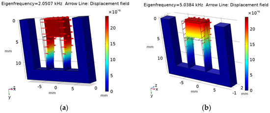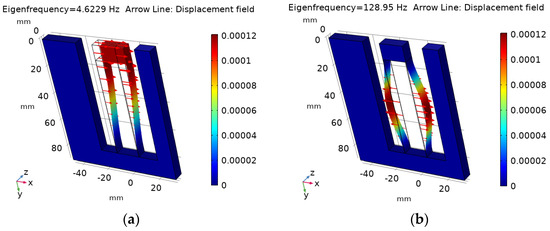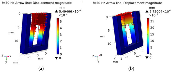 To assess the rigidity of the OMAS in all three directions, calculations were carried out to determine the displacements of its moving part 1 (see Figure 1) when forces were applied in various directions at operating frequencies no less than 10 times lower than the considered first natural frequency of the OMAS fef1. Figure 4 shows the results of modeling the shape of the displacement modes for MEF OMAS when applying a force F = mtmMEF·g = 0.001 N (where g = 9.8 m/s) with a frequency fo = 50 Hz < fef1/10 (fef1 = 660.8 Hz—see Figure 3a) in the x (Figure 4a) and z (Figure 4b) directions. The simulation also showed that, when forces are applied with frequencies f < fef1/10, the displacement levels for all frequencies are practically the same.