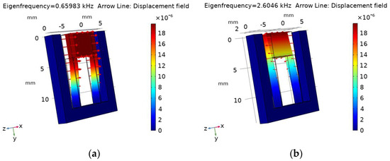 We consider that the OMAS is made of a single piece of fused silica. The geometrical parameters of the OMAS are as follows: x1 = 2.75 mm, x2 = 4 mm, x3 = 5.5 mm, x4 = 4 mm, y1 = 4 mm, y2 = 7.5 mm, y3 = 2.5 mm, the test mass 1 thickness htm = 2.2 mm, its mass mtm = ρfs·y1·x3·htm = 0.1 mg, flexures 2 supporting the test mass have a length Lfl = y2 = 7.5 mm, a width wfl = htm = 2.2 mm, and a thickness dfl = 300 μm (see Figure 9a). The outer frame 3 has a side surface S. In this case, the first natural frequency increases by almost 30% in comparison with the case of the same OMAS with two flexures (see Figure 10a,c) and the ratio between the second and the first eigenfrequencies remains practically the same (see Figure 10b,d).