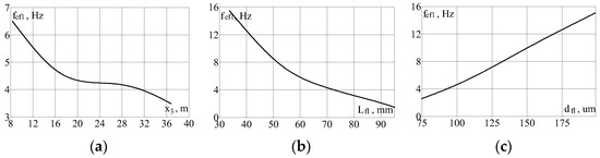 Calculated distributions of the first eigenfrequency (fef1) versus the VLEF OMAS parameters: (a) fef1(x3); (b) fef1(Lfl); (c) fef1(dfl).