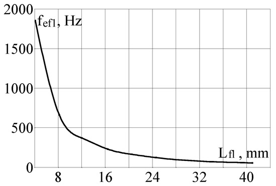 Simulations were also performed when the MEF OMAS was used as a base variant. It was also considered that the dimensions of the side of the test mass on which the accelerometer mirror is attached were unchanged. The calculated dependence of the fef1 versus the length of the flexures is presented in Figure 8: it can be seen that the fef1 increases substantially with a decrease in the Lfl.