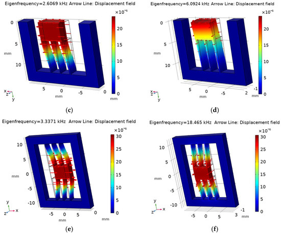 Calculated the first (a) −fef1 = 2050.7 Hz, (c) −fef1 = 2606.9 Hz, (e) −fef1 = 3337.1 Hz, and the second (b) −fef2 = 5038.4 Hz, (d) −fef2 = 6092.4 Hz, (f) −fef2 = 18,465 Hz eigenmodes for the two-flexure OMAS (a,b), the three-flexure OMAS (c,d), and the six-flexure OMAS (e,f).