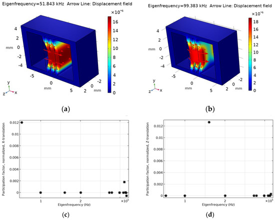 Mechanical characteristics of the OMAS with six flexures (see Figure 9b). (a) −fef1 = 51.9 kHz, (b) −fef2 = 99.4 kHz are calculated the first and second eigenmodes correspondingly; (c,d) are calculated normalized participation factors for the X and Z translations (each asterisk corresponds to a definite level of a participation factor at a particular eigenfrequency).