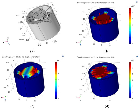 (a) Round drum-type OMAS geometry [10]; (b) −fef1 = 1025.3 Hz, (c) −fef2 = 2062.7 Hz, and (d) −fef3 = 18,915 Hz are calculated displacement mode shapes for the first three eigenfrequencies.