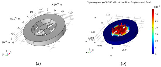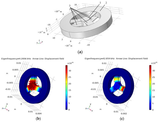 (a) Proposed drum-type OMAS design with straight flexures; (b) fef1 = 4.2 kHz; and (c) fef2 = 42.859 kHz are the calculated first and second displacement eigenmodes, respectively.