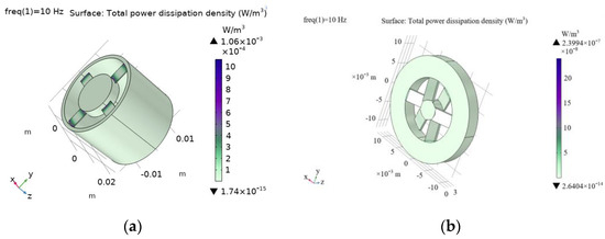Calculated distributions of the dissipation power density when the acceleration az = g (fo = 0.5 Hz) is applied in the z direction. (a) OMAS with three pairs of flexures; (b) OMAS with six evenly located flexures.