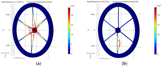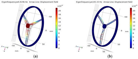The first (a) −fef1 = 5.3745 Hz and second (b) −fef2 = 143.79 Hz displacement eigenmodes calculated for the out-of-plane OMAS design with six evenly located flexures (see callout to Figure 17b) providing the low first eigenfrequency and reduction in the dissipation losses.