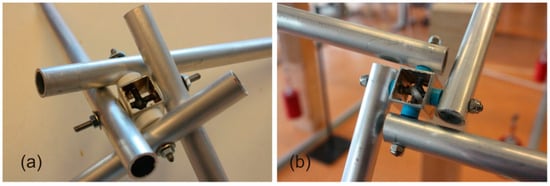 The linkages are formed from sections of 20 × 20 × 20 mm and 1 mm-thick aluminium hollow tube (SHS) of the same quality. The pivots are formed with 4 mm threaded steel rods that are welded in the central part. The screws and threaded rods are made of quality 5.6 steel according to ISO 898-1 [32], with an elastic modulus of 200,000 N/mm2, elastic limit of 300 N/mm2 and breaking load of 500 N/mm2 with an elongation of 20%. To achieve reciprocal support of the linkages, plastic washers have been placed that allow the exact separation of the axis of the linkage to be set, as seen in Figure 2.