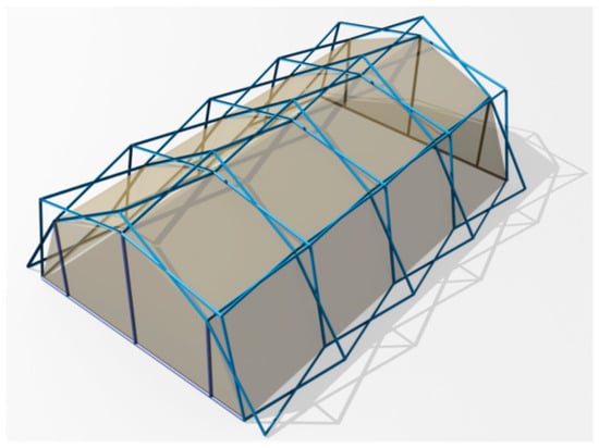 This article analyses the application of this system to cylindrical vaults with truncated cone-shaped ends (Figure 1). The solution of the ends is one of the problems of cylindrical vaults [27] and the use of this type of ends allows a more functional solution and improves the lateral stiffness of cylindrical vaults, which is much reduced in the case of deployable meshes with articulated linkages. In addition, the use of the reciprocal ones provides a very important lateral stiffness, which until now could not be precisely determined. This is especially important in the study of longitudinal wind action on these structures.